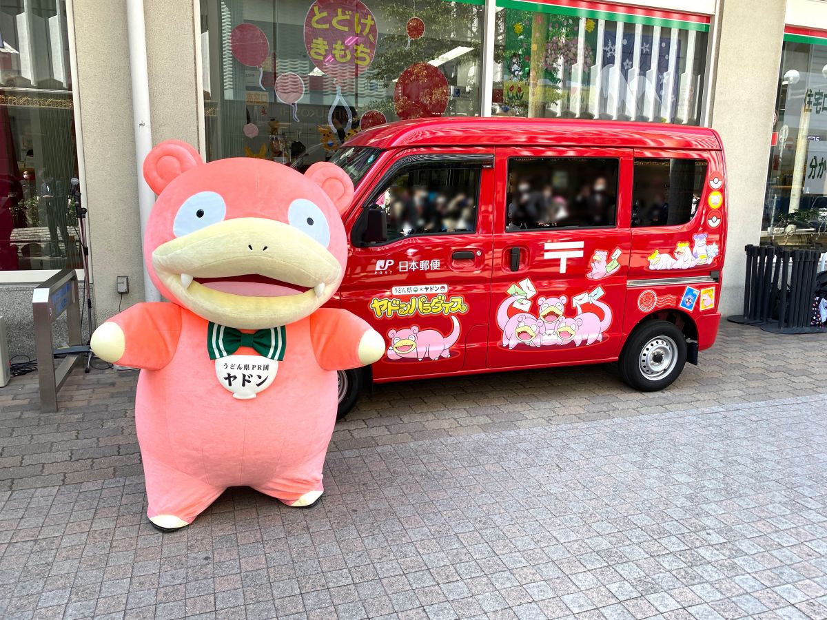 另外,在2021年的4月,香川縣就曾經設置過了「呆呆獸」郵筒!香川縣以出產手打烏冬聞名日本,而呆呆獸的日文「ヤドン(yadon)」與烏冬「うどん(udon)」讀音相近,因此呆呆獸就一直成為了香川縣的代表寶可夢(之前還改過名字叫呆呆縣呢~詳情可以看這裡),郵筒上面還能看到可愛的他坐在一碗烏冬麵裡頭,後面還有著想吃麵的大舌貝呢~