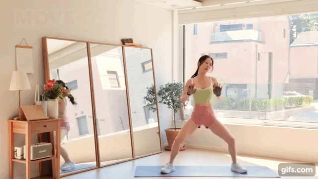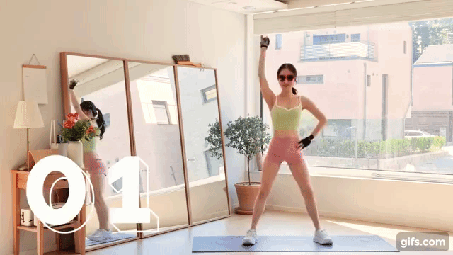 深蹲兩下後,雙腳抬腿,想像手肘要碰到膝蓋的感覺,並配合音樂律動進行4組動作,每20秒結束後別忘了喝口水休息一下喲~