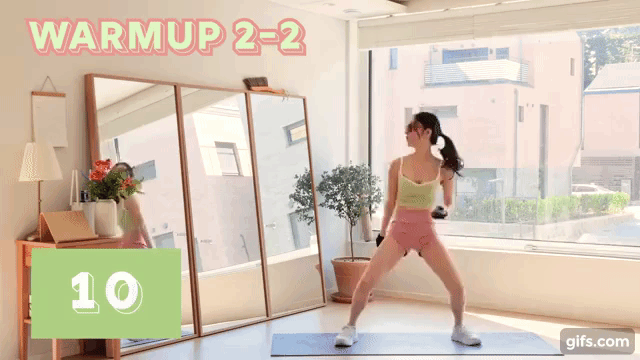 接下來進入正式的Tabata運動,雙手虎口交錯,先寬深蹲兩下,接著向左右畫圓甩手,跟著音樂擺動80秒,另外也要記得寬深蹲時,膝蓋不能內八喲~
