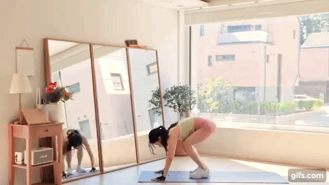 最強燃燒肥肉秘密武器「波比跳」來了!身體呈現深蹲>>伏地挺身>>蹲下>跳躍,以此為循環進行,伏地挺身時別忘了收腹,並運用大腿力量向上帶起回到站姿。