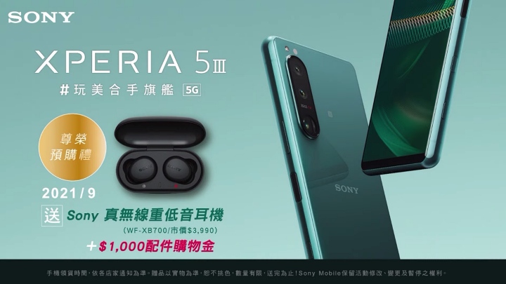 Xperia 5 III 預購活動將於後續公布活動開始時間,於指定通路預購 Xperia 5 III 手機,將可獲得 Sony 真無線運動重低音耳機(WF-XB700)以及 1000 元配件購物金或配件購物組。