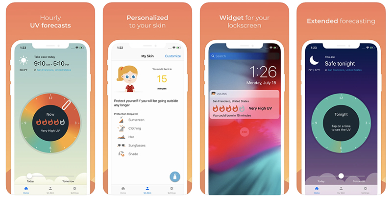 「UV Lens」這款App可以點選所在地區和時間就能查詢紫外線程度,當火焰警示亮起就表示紫外線含量達到危險值,則會建議使用者「此刻別出門」!且「UV Lens」也能提供個人化建議,輸入膚色、髮色和慣用的防曬乳,加上你的今日計畫,App 就會發送通知告訴你:「等等會超標,趕快躲太陽」等警訊。