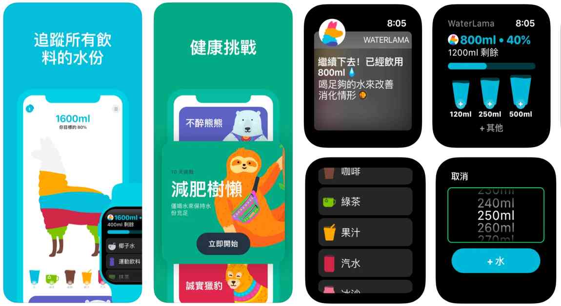 「喝水提醒 習慣Water Llama」在App Store擁有超過2萬則以上的五星評論。除了有可愛逗趣的羊駝提醒你何時喝水,人性化的考量將常喝的30種飲料也一併納入資料庫,告訴你適量攝取。使用 Apple Watch 並搭配不醉熊熊、減肥樹懶和誠實獵豹等討喜的小幫手,不只守住健康,紓壓和提升工作效率都有牠們的貼心協助。