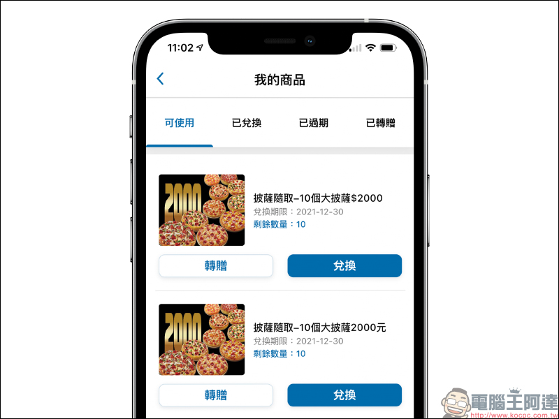 購買完成後,在「我的商品」頁面能查看可兌換的披薩數量。