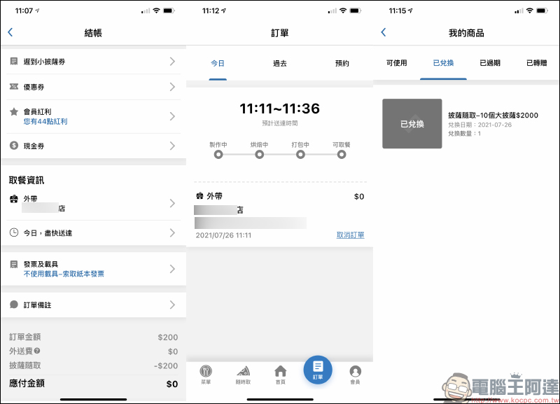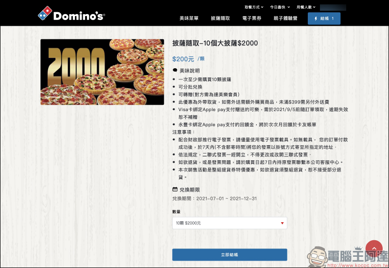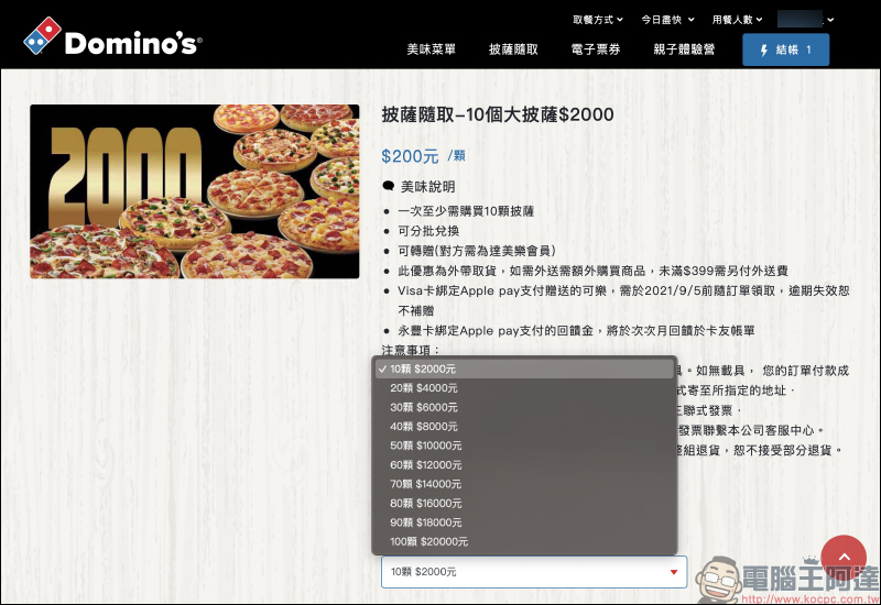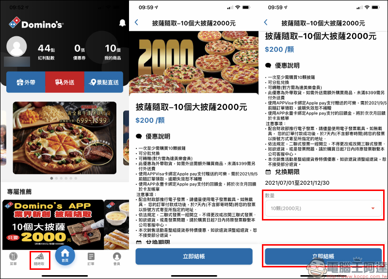 達美樂推出「披薩隨取」 功能, 10 個大披薩只要 2,000 元!(平均每個 200 元,可分批兌換)