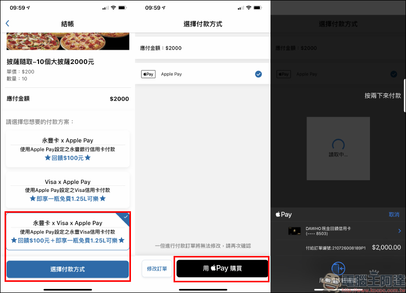 除此之外, iOS 用戶使用達美樂 App 訂購並使用永豐卡綁定 Apple Pay 進行付款,將再加碼贈送 100 元刷卡金;如果是使用 Visa 卡綁定 Apple Pay 支付再送大可樂(1.25L),上述兩種優惠可同時使用。