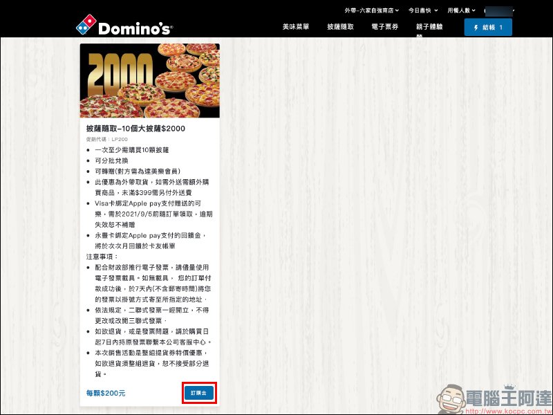 接著就能看到這次「披薩隨取 10 個大披薩 $2000」的活動,確認內容後點選「訂購去」進入下一步:
