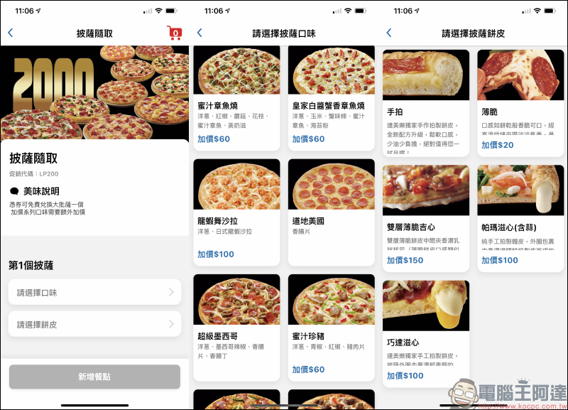 點選「兌換」後,接著依序選擇披薩口味和披薩餅皮。