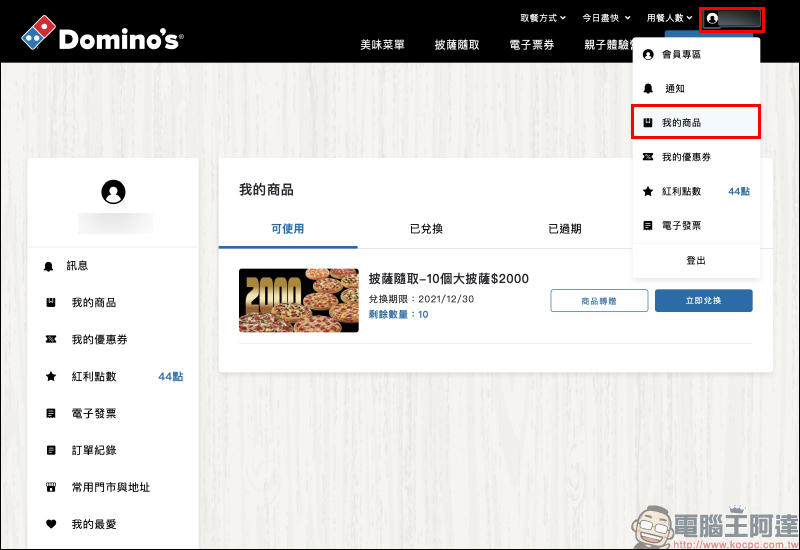 在購買完成後,點選會員專區的「我的商品」就能看到此次活動買到的披薩優惠,在這也會提醒消費者兌換期限和可兌換的剩餘數量。