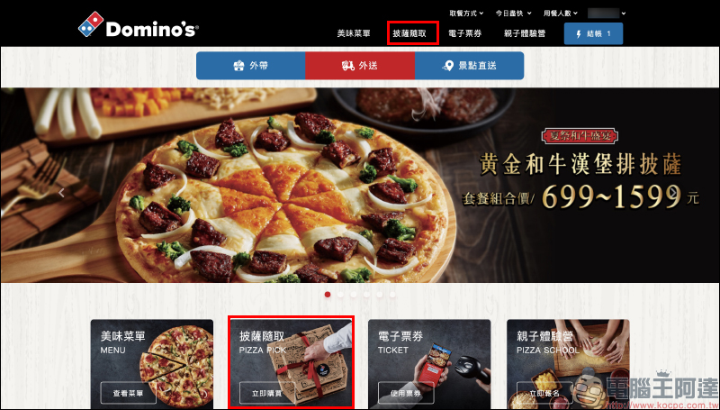 首先,開啟達美樂官網(點我前往)後在首頁找到「披薩隨取」連結進入: