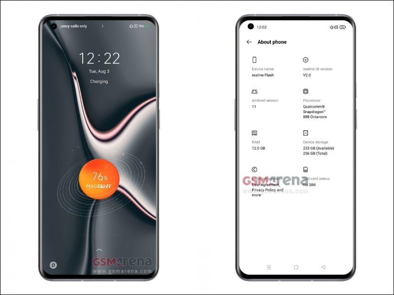 外媒 GSMArena 也爆料了 realme Flash 新機的規格重點,傳聞機採用左上角打孔的曲面螢幕,機身背面配備三鏡頭主相機。性能部分則預計搭載高通 Snapdragon 888 5G 旗艦行動平台、12GB RAM 和 256GB ROM 。系統方面則將運行 realme UI 2.0(基於 Android 11)。