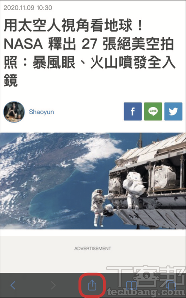 步驟3.再來以 Safari 開啟欲存取的照片頁面,並點擊下方工具列的「分享」圖示。