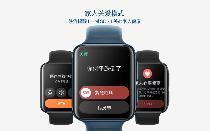 在 OPPO Watch 2 內建的家人關愛模式,能將手錶的健康數據透過 App 分享給其他家人查看,同時也加入了跌倒偵測功能會再偵測到用戶跌倒時發出警報通知,能透過手錶一鍵進行緊急呼叫。