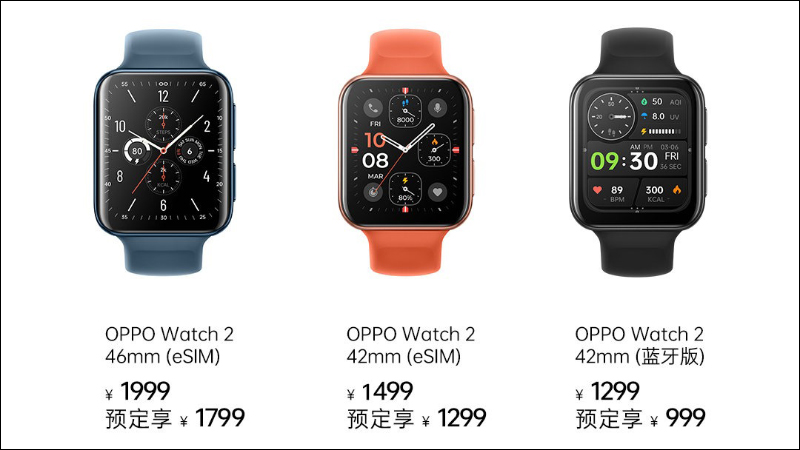 售價方面, OPPO Watch 2 目前提供三種型號選擇,價格分別為 OPPO Watch 2 46mm 的 eSIM 版本售價人民幣 1,999 元(約合新台幣 8,654 元);OPPO Watch 2 42mm 的 eSIM 版本售價人民幣 1,499 元(約合新台幣 6,489 元);OPPO Watch 2 42mm 的藍牙版售價人民幣 1,299 元(約合新台幣 5,653 元)。