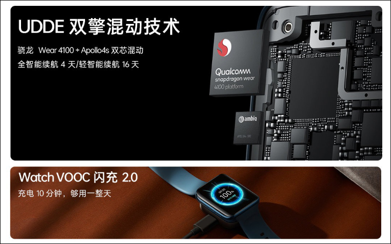 針對續航部分, OPPO Watch 2 全系列採用 UDDE 雙擎混動技術,搭載高通 Snapdragon Wear 4100 以及與 Ambiq 聯合開發的A pollo 4s 雙晶片,可根據使用場景實現更好的續航和性能表現。 OPPO Watch 2 46mm 版本在全智慧模式續航時間可達 4 天,全新升級的輕智慧模式也能有 16 天的超長續航。此外, OPPO Watch 2 也支持 Watch VOOC 閃充 2.0 技術,只需充電 10 分鐘就能使用一整天,充滿電也僅需 60 分鐘。