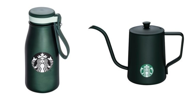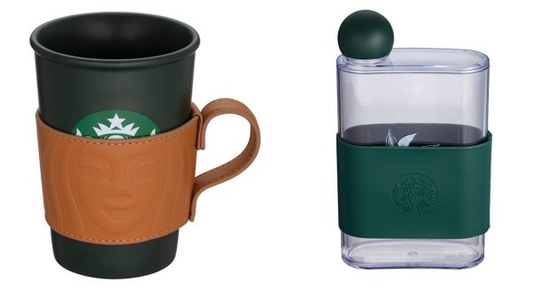 以夜幕綠為主色調的共推出「馬克杯附隔熱套」、「冷水壺附套」、「不鏽鋼杯」、「不鏽鋼水壺」、「TOGO 冷水杯」和「手沖壺」等,妞編輯大推「馬克杯附隔熱套」,仿皮革材質,上面刻有星巴克經典人魚,給人一種高奢感!