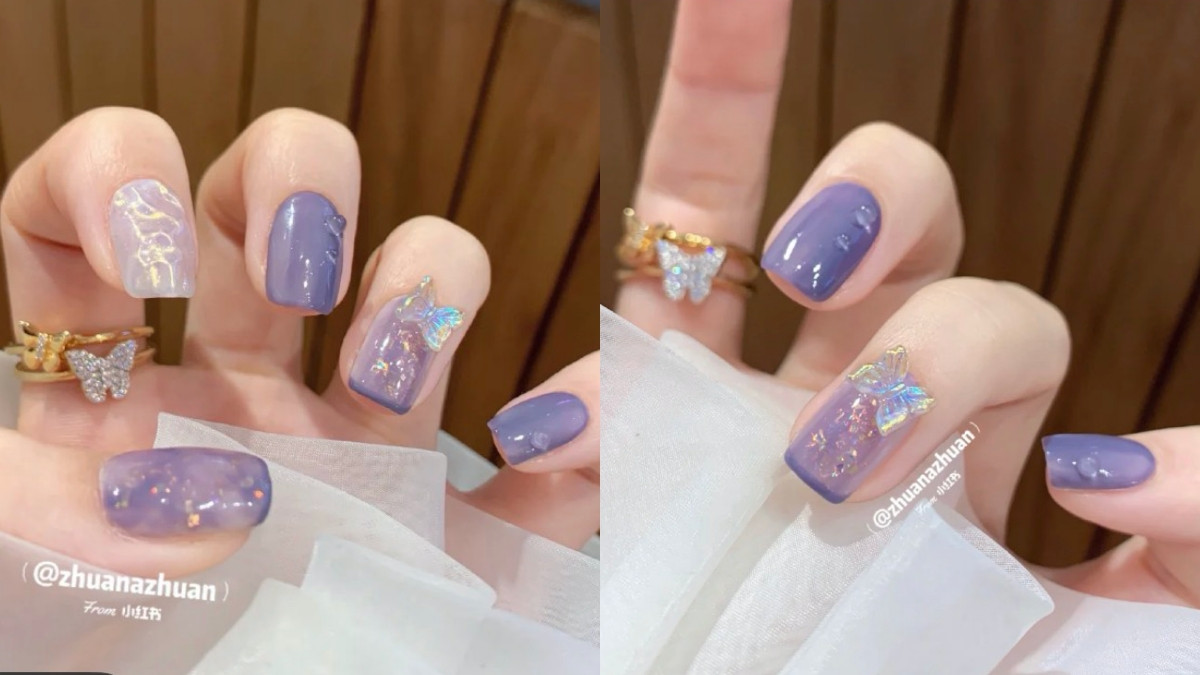 想像有一隻蝴蝶停在你的指尖,那畫面實在太夢幻!這款「紫蝶翩翩」在小紅書上討論度也很高,還融入小水滴、暈染、金屬皺摺等元素,真的是美到讓人分心,忍不住盯著手指看~