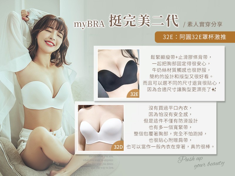 市售平口內衣總是讓妳的胸部又垂又難看嗎?只能忍痛放棄穿著細肩帶、平口的漂亮衣服嗎?大胸女孩們有福了!myBRA獨家為大罩杯女孩設計,與一隻阿圓聯名的「挺完美二代」平口內衣出爐了!罩杯尺寸B-J Cup,市面少見的GHIJ平口尺寸真的超貼心,挺完美二代附贈「拉提肩帶」及「滿滿水餃墊」,讓妳一衣兩穿,隨個人喜好調整穿著