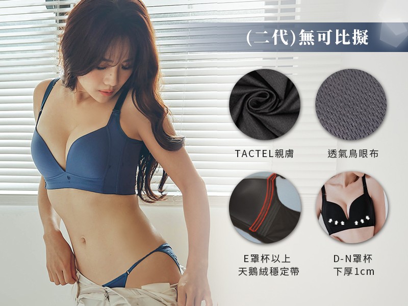 (二代)無可比擬在材質上使用TACTEL及鳥眼布的透氣材質,快乾親膚不悶熱!針對大罩杯更是做了許多貼心設計,D-N罩杯做下厚1cm設計,幫助上胸提托支撐,E罩杯以上使用天鵝絨穩定帶及三膠條設計,搭配加高土台支撐胸部重量!大罩杯女孩擁也能又挺又包覆!