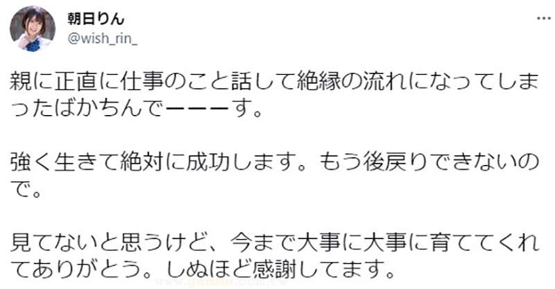 打著「曾經擔任過地下偶像」、「G罩杯」、「20歲」的日本AV女優朝日りん在7月1日表示即將正式出道,然而這位二十歲的妹妹,她的家庭關係更加引發了網友的注目。因為她最近自己爆料,表示她跟爸媽坦承自己轉去拍AV以後,無法獲得他們的諒解,斷絕了親子關係了!然而也因為這樣,她獲得了大量關注。
