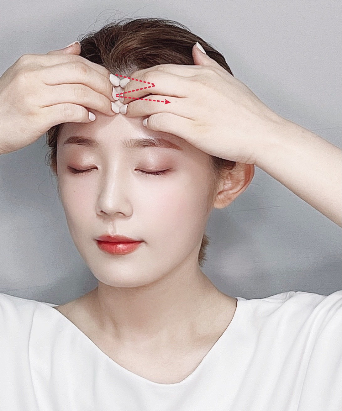>> 「從眉毛到額頭,再針對髮際線按摩」為一組,每次持續10秒/共做3組