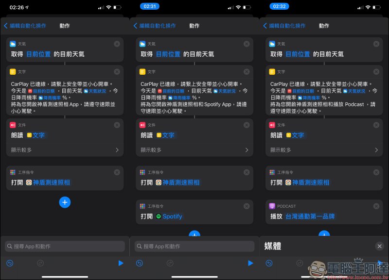 若想一併在播報天氣的內容更豐富,像是「降雨機率」也能自行設定。當然,如果想自動開啟「神盾測速照相」、「Podcast」、「Spotify」等 App ,也能設定在最朗讀文字後方的「打開 App」指令。如此一來,自動化操作就會依照設定在朗讀文字後,打開指定的 App 。
