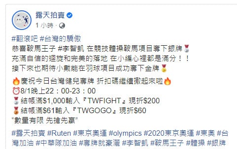 而今天因李智凱在競技體操鞍馬項目奪下銀牌,所以露天拍賣便又在8月1日晚上22:00-23:00,推出結帳滿$1,000輸入『TWFIGHT』現折$200;結帳滿$61輸入『TWGOGO』現折$60的折扣碼。