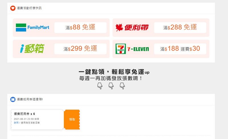 另外進入8月,露天拍賣也提供運費抵用券領取,凡有開放運費抵用券的店家都能使用,全家滿99免運,7-11滿199免運。