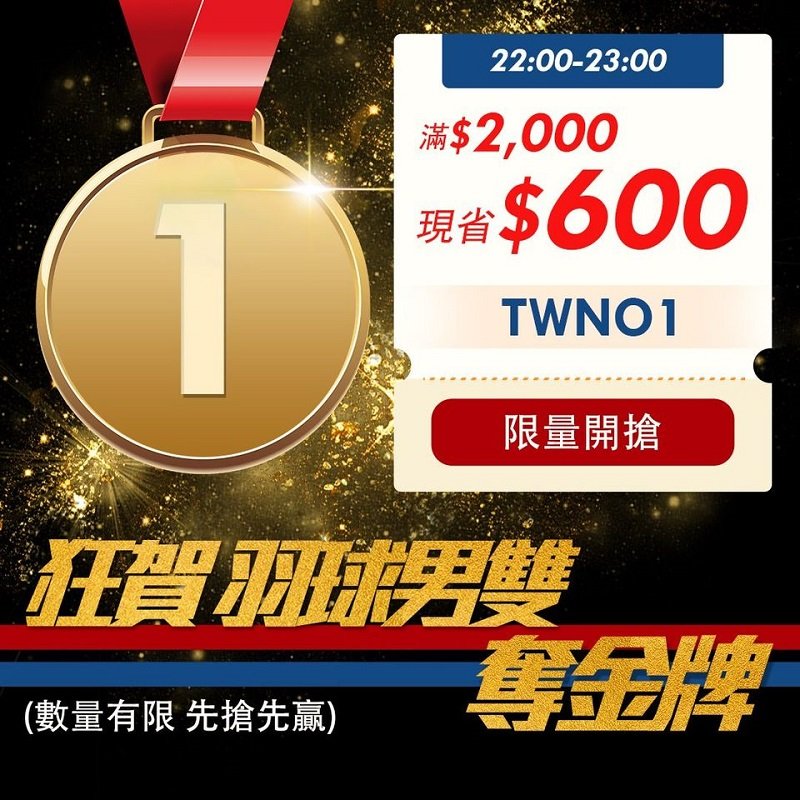 露天拍賣最近推出了「挺臺灣選手狂撒折扣碼」活動,配合選手贏得獎牌會於指定期間推出滿額限量折扣碼活動,像是昨天臺灣的李洋與王齊麟在羽球男雙中獲得金牌,就直接提供從7月31日晚上22:00-23:00,提供結帳滿$2,000輸入『TWNO1』現折$600元的活動,吸引許多人下標使用。