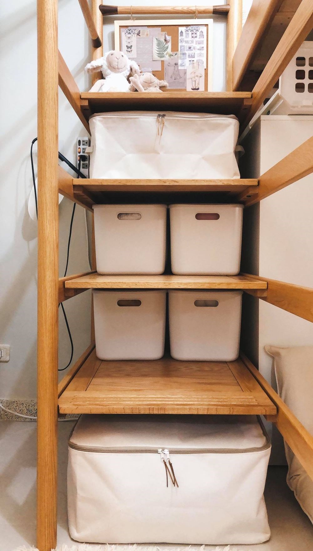 4. Can Do 的收納盒:⼤創、i color 似乎有類似的款式,但她喜歡奶油⾊的 Can Do 收納盒,⽤來放蕾絲、織帶、⼩公仔、髮帶等都行,在浴室也放了幾個收納盒,來擺個⼈衛⽣⽤品,好拿取、防塵又防⽔氣。
