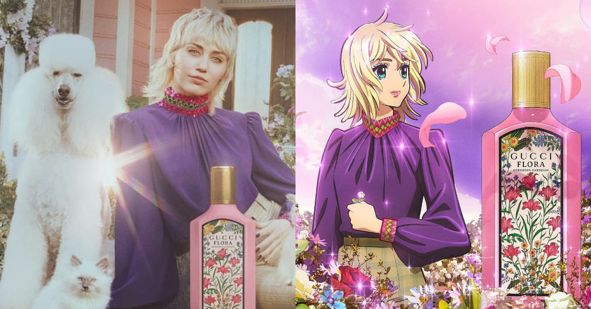 為了讓香水不只侷限於嗅覺上的體驗,Gucci也邀請藝術家Petra Collins,以日本動漫的流行元素、奇幻故事做為靈感延伸,為新香水執導和拍攝#FloraFantasy夢遊仙境形象廣告!故事背景講述,主角Miley Cyrus伴隨著白色貴賓犬和波斯貓在花團錦簇的家中嬉戲,並藉由花香轉變為動畫角色,同時藉由電吉他的樂聲轉場進入夢幻海景中。透過超現實的畫面,營造出電影感的二次元夢境,也讓女性香水跳脫過往的框架:即使是搖滾樂手也值得擁有一場花花世界的少女夢。