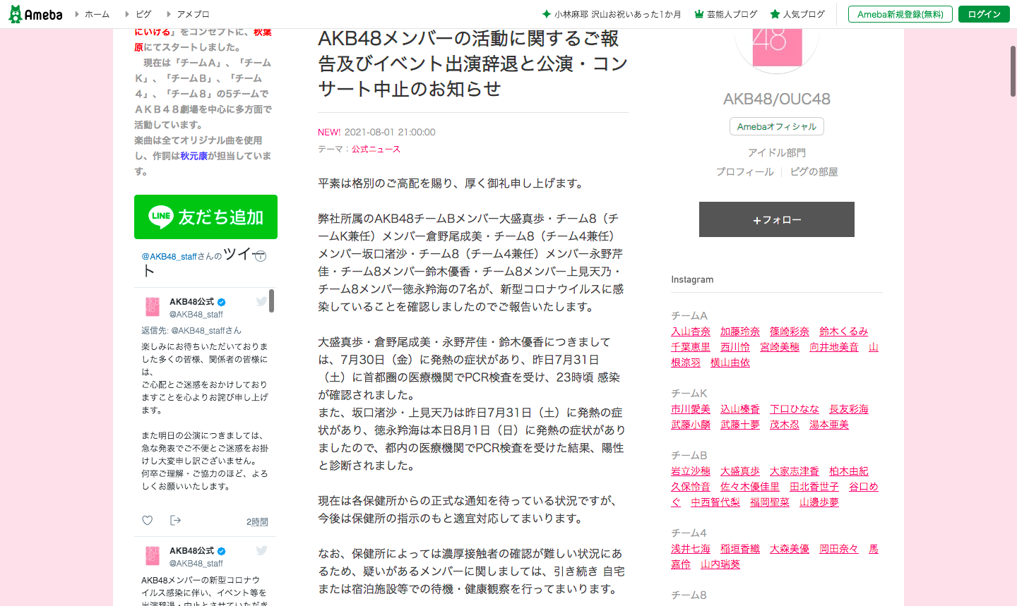 日本偶像女團AKB48爆發集體感染,繼上月29日Team8成員行天優莉奈確診新冠肺炎後 AKB官方網誌今日(1日)再宣布有多7名成員中招,包括大盛真步、倉野尾成美、坂口渚沙、永野芹佳、鈴木優香、上見天乃及德永羚海! 由於確診人數眾多,醫療機構表示已經難以確認密切接觸者,而AKB原定明日(2日)至本月8日的多場演出將會取消。 鈴木優香 德永羚海 坂口渚沙 倉野尾成美 永野芹佳 大盛真步 上見天乃 希望大家都能平安無事(祈禱)