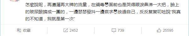 此外,有網友31日在微博上爆料,「怎麼說呢,再瀟灑再大牌的流量,在緝毒面前也是哭得眼淚鼻涕一大把,臉上的玻尿酸擠成一團的,一邊瑟瑟發抖一邊哀求放過自己,反反覆覆叨念說『我真的不知道,我就是第一次』。」