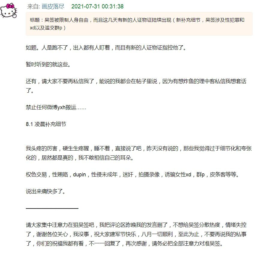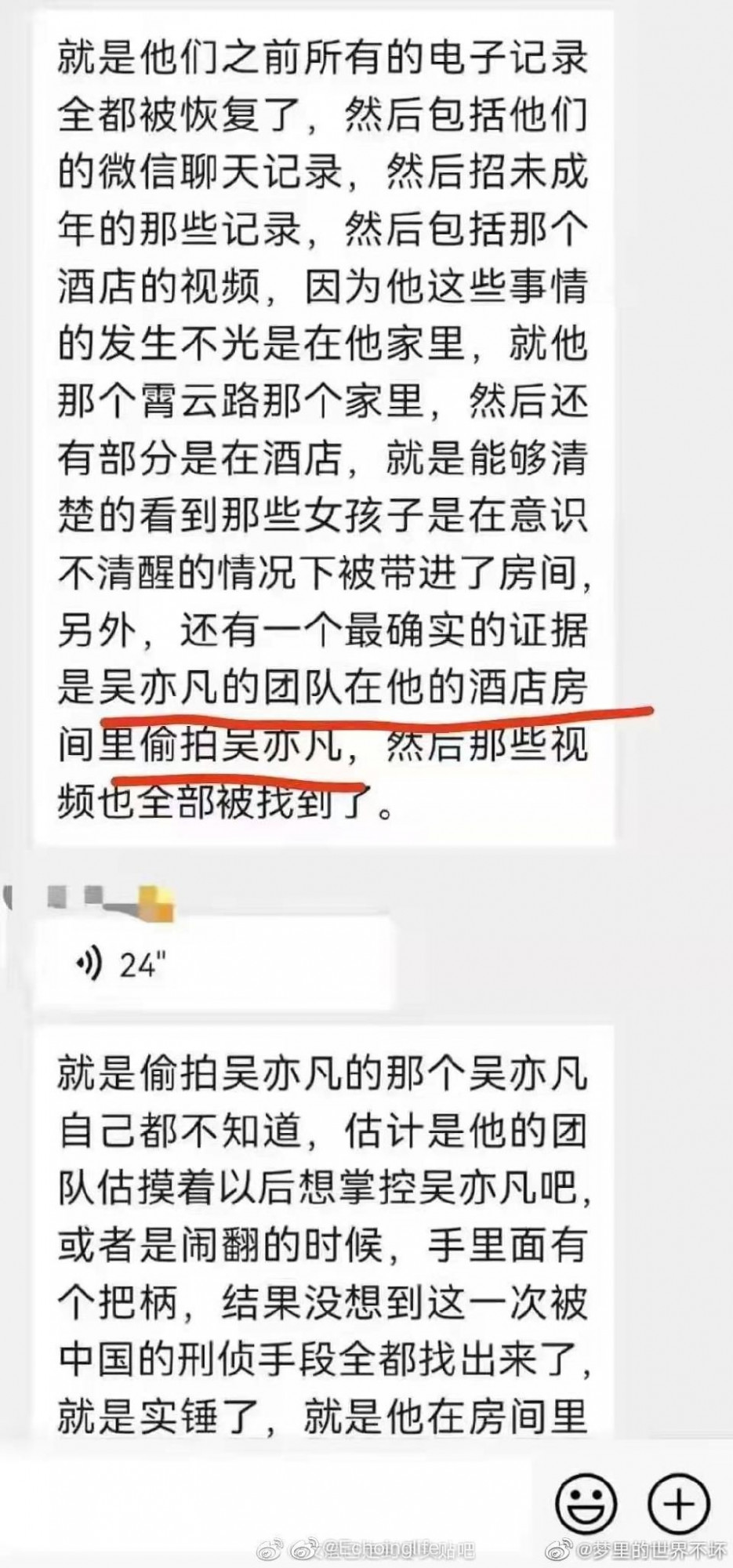 網友更爆出經警方調查、復原吳亦凡本人及團隊、友人的手機訊息後,因發現吳亦凡疑似和『13歲』的上海女粉絲發生性行為,才會對他發出「拘留」。