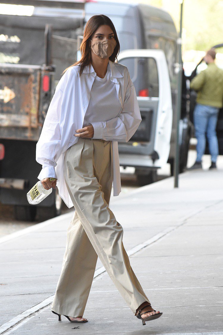 上衣以白T打底並在外搭上一件輕薄的白襯衫,增加整體的層次感,下半身則是配上米色的落地褲及一般的白色帆布鞋,或是跟Kendall一樣選擇黑色的高跟涼鞋,這樣一來可以讓整體不過於休閒~