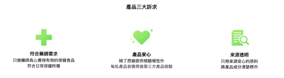 嚴格把關每批產品的每個步驟,用來源安心的原料、列詳細清楚的成分標示,過第三方的檢驗認證;做自己都能安心補充的保健食品。