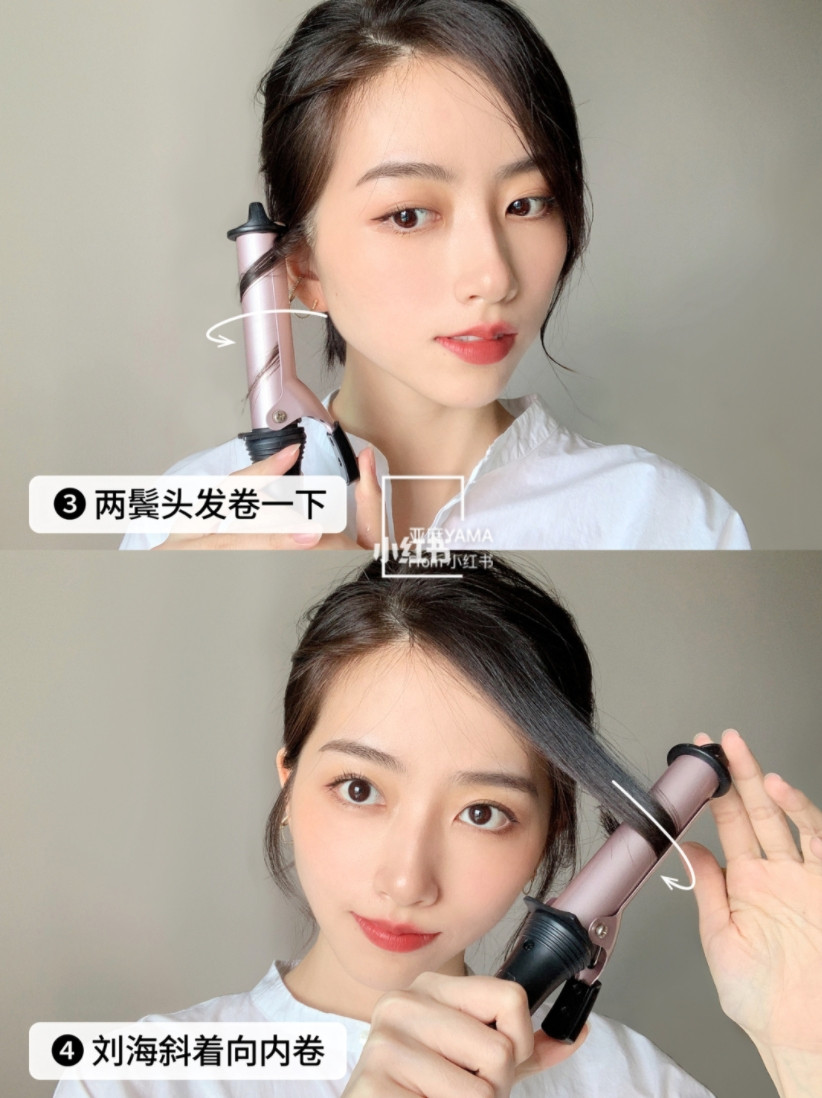 STEP3:8比例(頭髮較多那側)的瀏海,電棒斜著向內捲一個彈性弧度。這樣就能讓臉蛋輪廓更流暢飽滿囉!