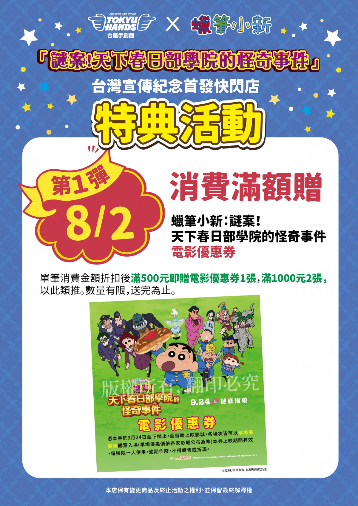 為了回饋熱愛小新的粉絲們,單筆消費金額折扣後滿500元即可獲得2021年電影《蠟筆小新:謎案!天下春日部學院的怪奇事件》的電影優惠券1張,滿1000元贈2張,以此類推,數量有限,送完為止。憑電影優惠券至上映影城,各場次皆可以早場優惠價觀看2021年電影《蠟筆小新:謎案!天下春日部學院的怪奇事件》,小新粉絲們可不要錯過啦!