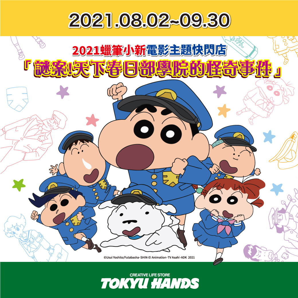 2021年最新電影《蠟筆小新:謎案!天下春日部學院的怪奇事件》宣布7月30日於日本上映啦!台灣同樣公開9月24日中日雙語版本也要與大家見面,為解決防疫期間苦悶,8/2~9/30在台北台隆手創館美麗華店舉辦電影紀念快閃店,先讓台灣粉絲們提前感受一下「學院制服小新」帥氣又可愛的魅力!