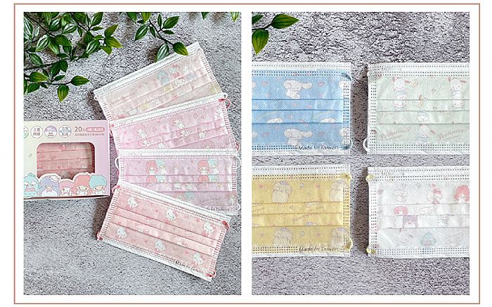 三麗鷗躲貓貓系列醫用口罩共有八款,六種組合,款式分別是躲貓貓(白色款)、躲貓貓(粉色款)、Hello Kitty、大耳狗喜拿、雙星仙子、布丁狗、美樂蒂、帕洽狗。