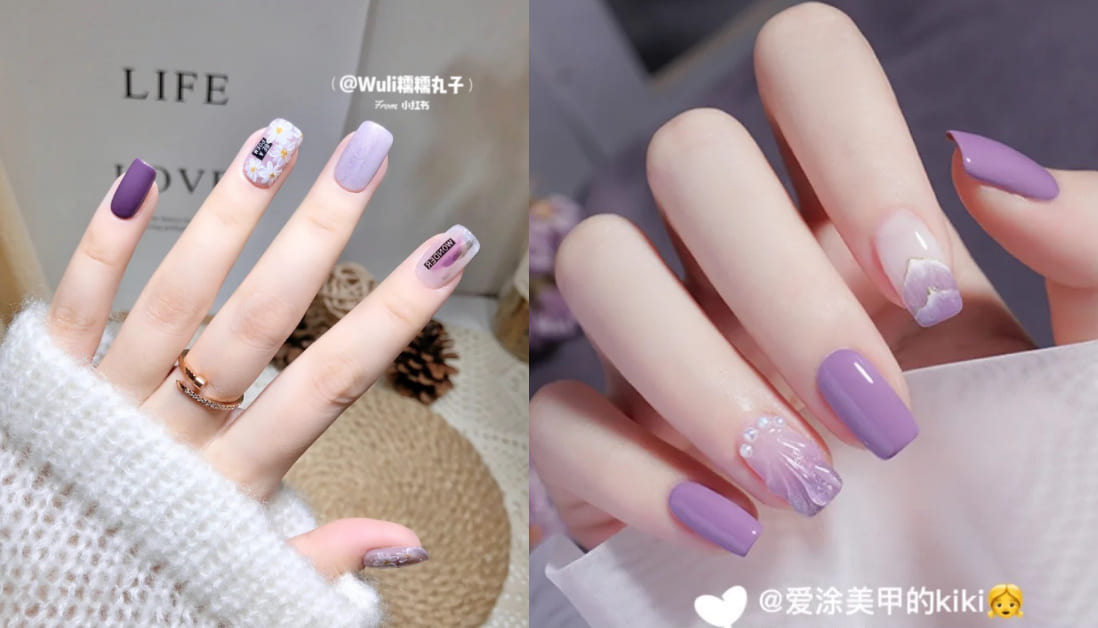 率先入榜的,也是今年春夏日韓少女圈搶破頭的「丁香紫」!別於一般紫色美甲的前衛感,帶有粉調的粉紫色系美甲擦上指尖,不僅溫柔度提升,還有種楚楚可憐的稚氣感!在光療造型的推薦上,可以和深紫色跳色搭配,又或者畫上今年最夯的小白花圖樣,不僅風格青春有活力,搭配小洋裝還有重溫初戀的錯覺呢!