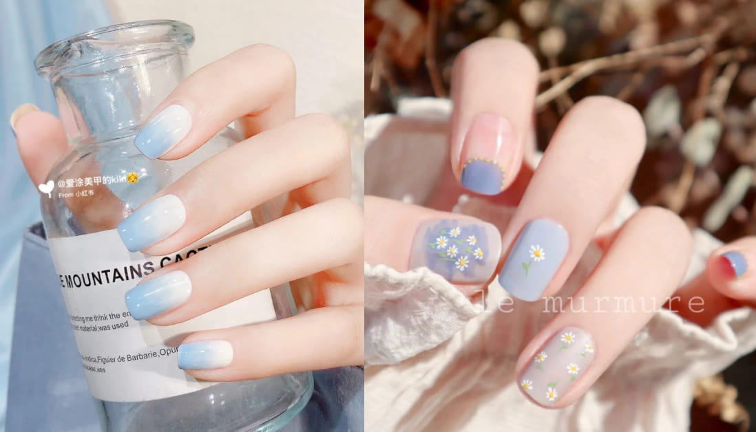 若你屬於膚色較健康、偏黃的女孩,寶寶藍色美甲則能幫你增添膚色與造型的清爽感!藍色是多數男性眼中最為舒適、自在且甜而不膩的色調~光療造型上推薦可以與白色系做渲染,又或者畫上手繪小花,都能讓指尖氣質度加分,甚至單擦搭配牛仔丹寧穿搭,還能創造男友風的親和力。