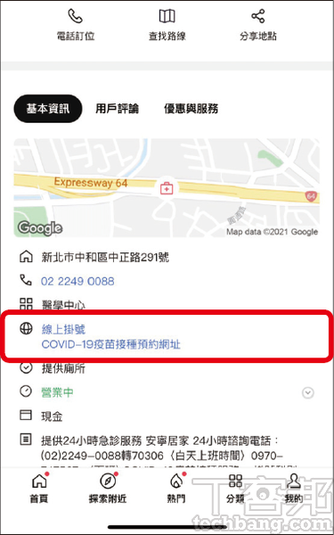 步驟5.選擇就近的院所後,會提供電話、路線、地點…等資訊,也可以直接點選,進行線上掛號。
