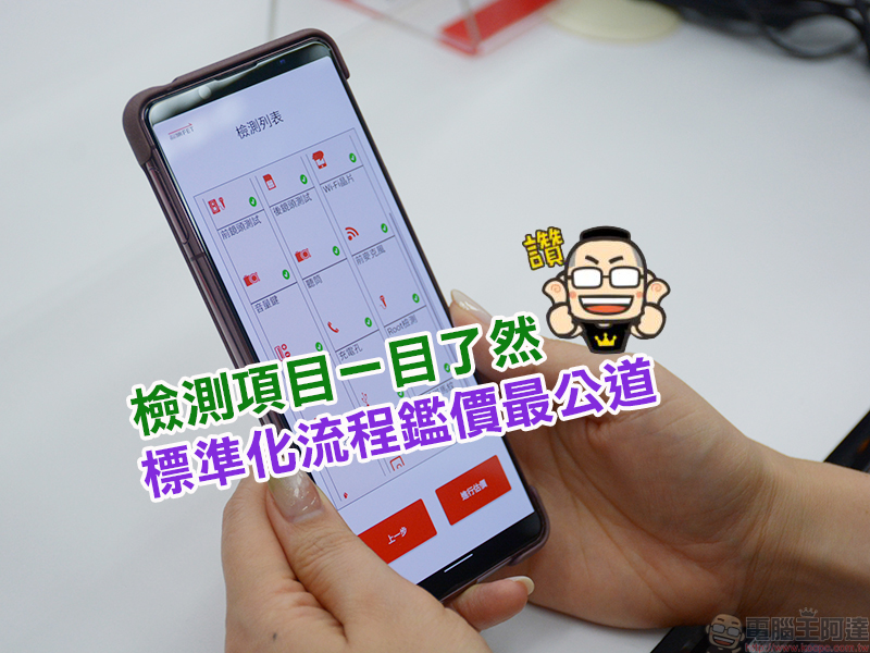 這部分是由人工加上攝影後系統檢查肉眼可見的特徵,針對舊機本身是否有受潮情況、刮傷,螢幕是否顯示正常、機殼外觀是否有損傷等。 - 軟體檢測部分