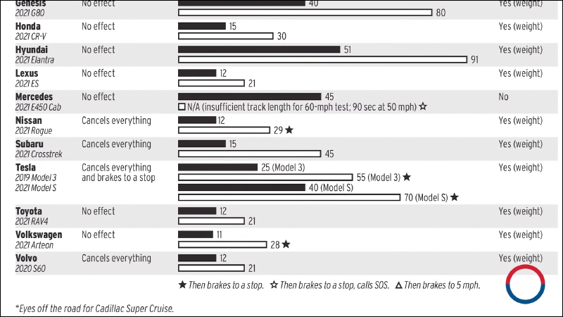 第二階段測試,外媒實測一樣定速 60mph 開啟車道居中,接著雙手從方向盤上移開,測試何時車輛會發出第一次警告訊息,以及持續沒有將手放上方向盤會經過多久時間關閉輔助駕駛系統。結果像是 Cadillac 、Ford、Volvo、Toyota 和 Lexus大約都在 21 秒內退出。