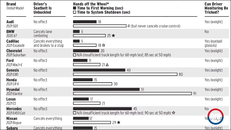 從外媒整理的這張圖表可以清楚看到各輛車在第一次警示和輔助駕駛取消的秒數整理,多數車輛都能被帶有重量的方式欺騙方向盤。