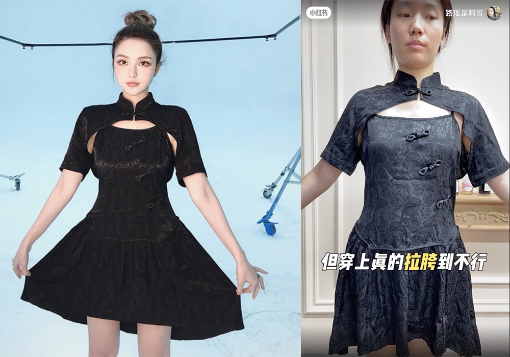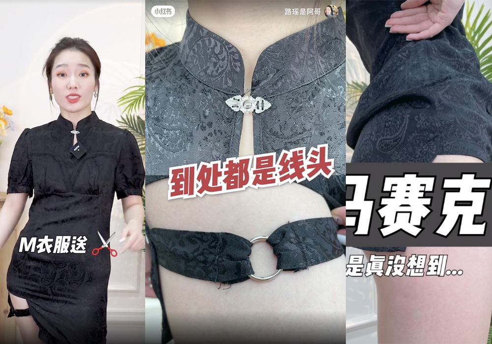 例如:「貼身辣妹旗袍」到處都是『線頭』,『長度』更是短得離譜,網紅也大批穿這件裙子完全沒辦法蹲、坐,甚至是大步走路。