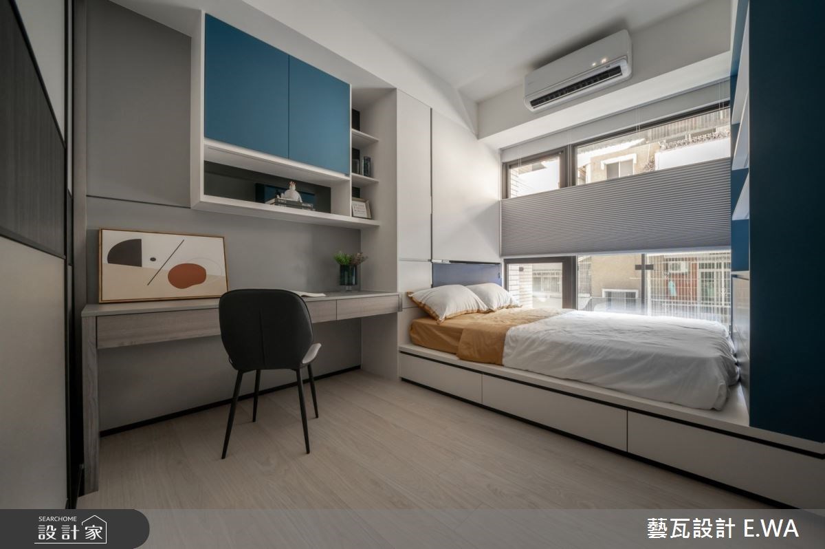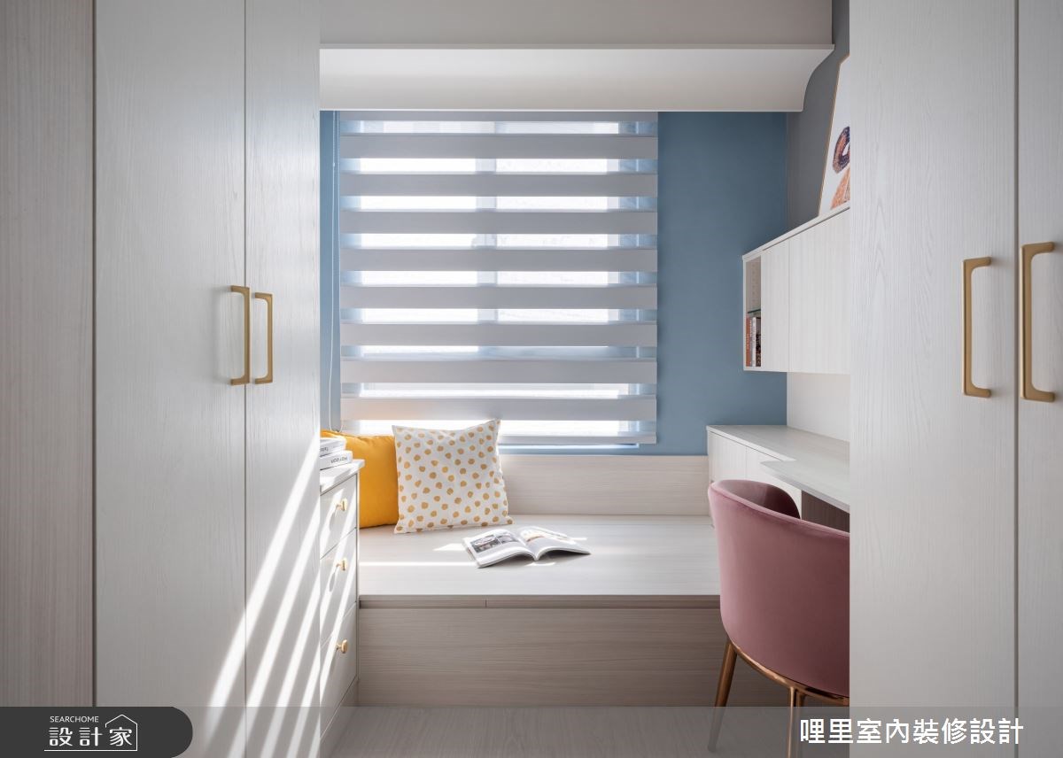 一家四口的 30 坪北歐風親子宅,透過格局調整、跳色手法、收納配置等各種細膩技巧,強化好採光、台北 101 窗景等地理優勢,並跳脫兒童房一定要童趣幼稚的既定印象,在窗邊規劃適當高度的抽屜式臥榻,加上床頭櫃、書桌、書架、一日衣櫃等生活機能,營造溫暖舒適的兒童房。