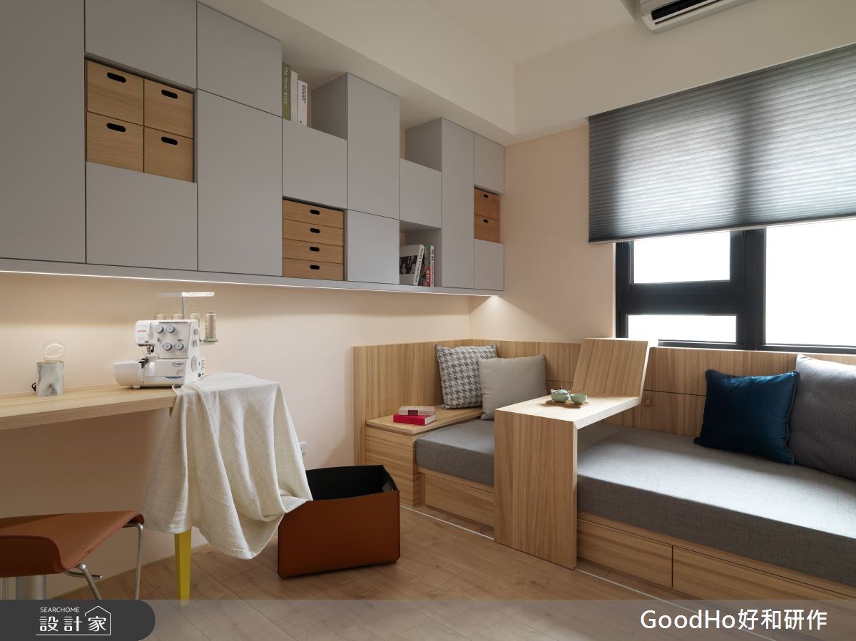 40 坪的現代風住宅,規劃了一間工作室,讓喜歡縫紉的屋主可以這邊作業,上層的收納櫃則能夠放置布料和相關器具,以及一些專業書籍,讓環境保持乾淨俐落。而長型臥榻設置了泡茶桌,搭配上掀式收納設計,方便屋主收拾及拿取茶具,縫紉累了就來一杯茶,養精蓄銳吧!