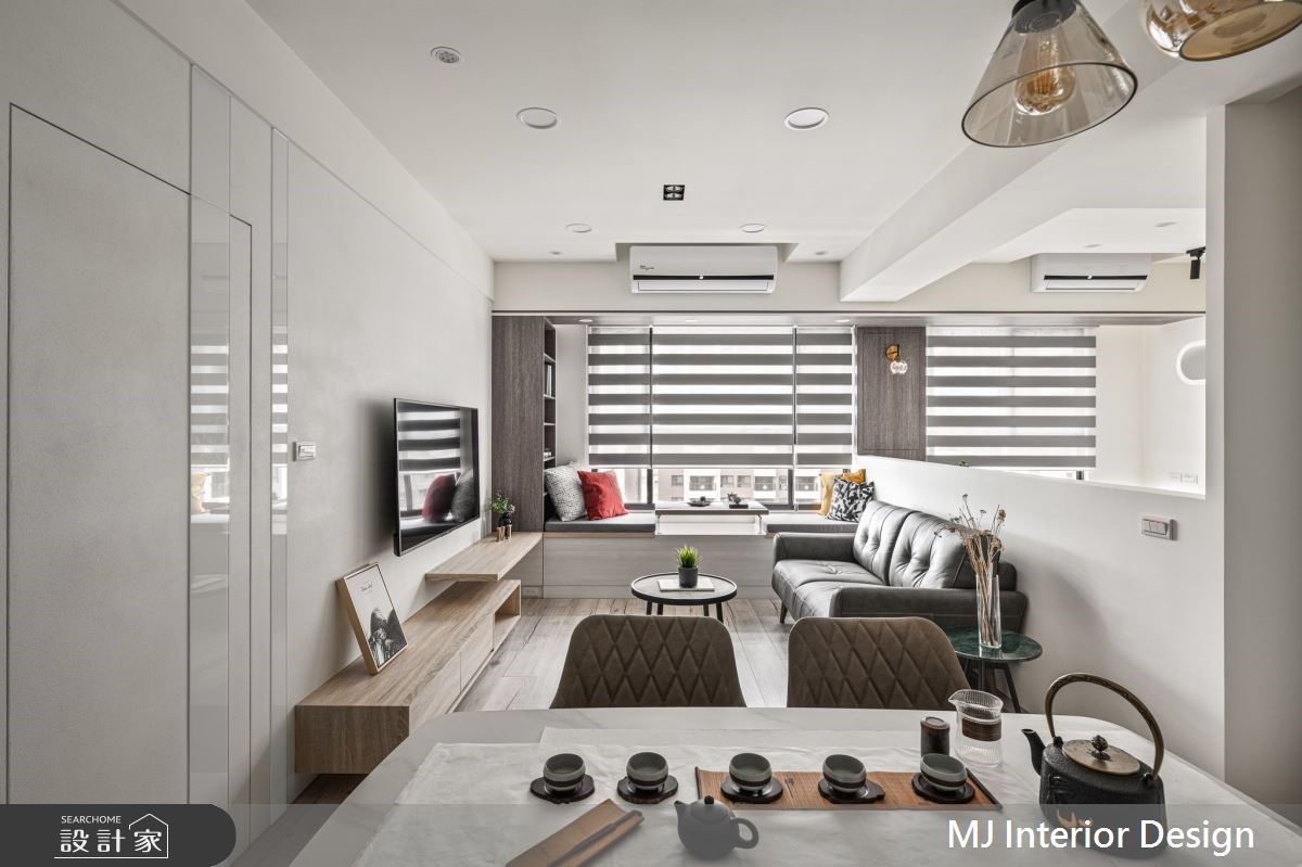 15 坪的簡約風中古屋,在小宅空間有限的情況下,整合客餐廳的生活機能,利用一道半高電視牆,先切割出廚房與客餐廳的界線,又不會有狹隘感,再延伸出小中島和長型餐桌,並用窗邊臥榻取代制式餐椅,讓公共空間擁有複合式機能,家人聚餐或是朋友聊天,都能感到放鬆自在。